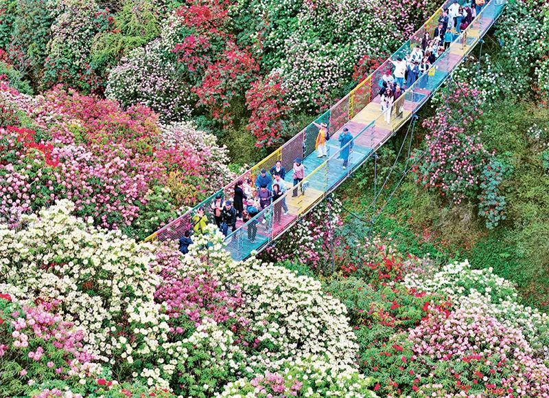 图为2024年4月4日,游客在贵州省毕节市百里杜鹃景区踏青赏花(无人机照片)。