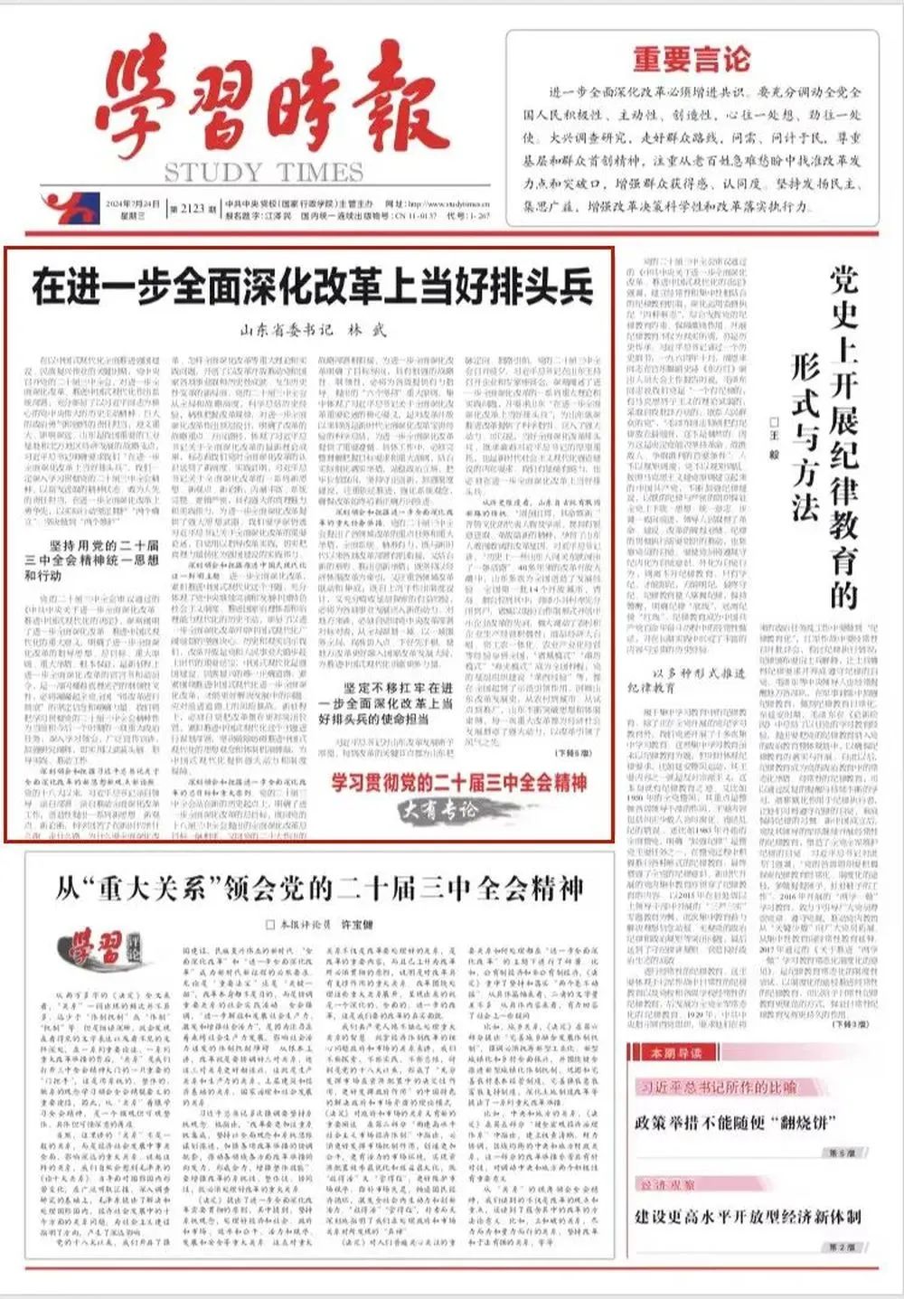 党的二十届三中全会聚焦推进中国式现代化,对进一步全面深化改革作出了系统部署。对山东来说,要全面抓好贯彻落实,同时结合自身实际,坚持问题导向,着力破解制约发展的深层次体制机制障碍和结构性矛盾,打开进一步全面深化改革新局面。