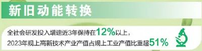 深化新旧动能转换。统筹优化传统产业,壮大新兴产业,布局未来产业,全社会研发投入增速近3年保持在12%以上,2023年规上高新技术产业产值占规上工业产值比重超51%,经营主体达1474万家。