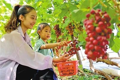 滨州市滨城区杨柳雪镇,游客在采摘基地内采摘葡萄。近年来,滨州市依托濒临黄河区位优势,积极推进生态水果产业和乡村旅游融合发展。