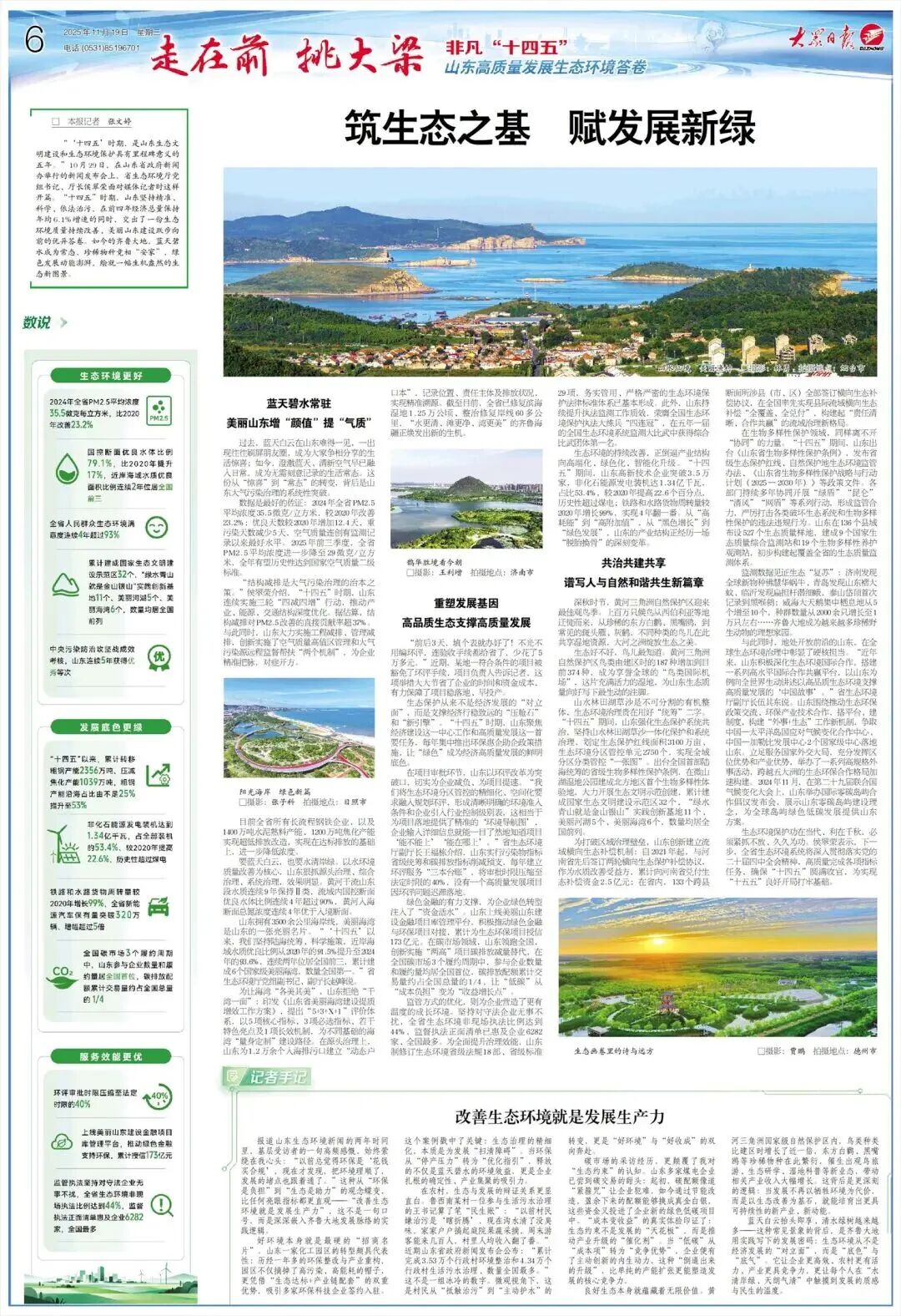 生态保护从来不是经济发展的“对立面”,而是支撑经济行稳致远的“压舱石”和“新引擎”。“十四五”时期,山东聚焦经济建设这一中心工作和高质量发展这一首要任务,每年集中推出环保惠企助企政策措施,让“绿色”成为经济高质量发展的鲜明底色。